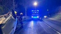 Ein PKW war von der Fahrbahn abgekommen und kam auf dem Dach im Straßengraben zum Liegen.